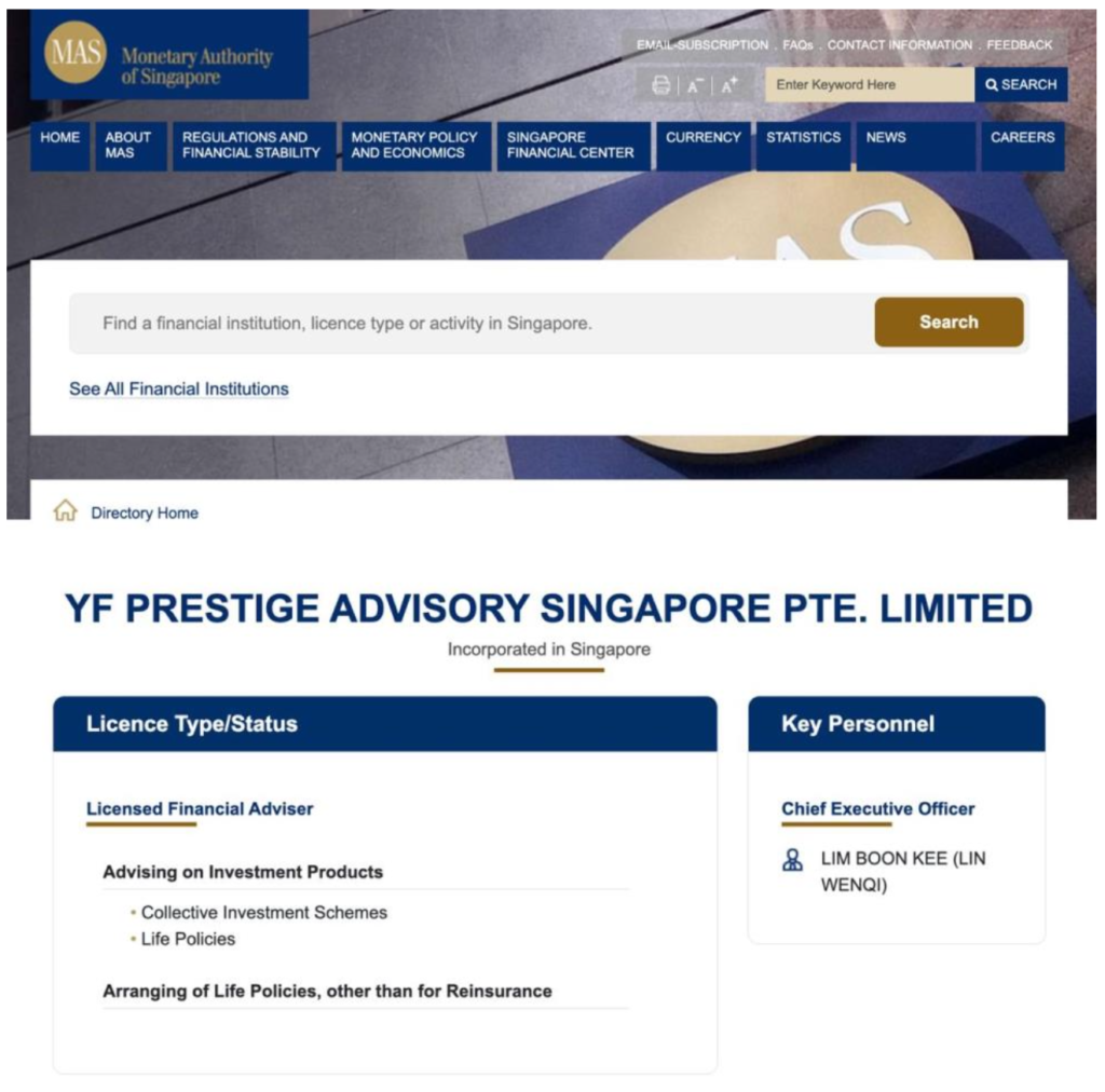 Source: Monetary Authority of Singapore (MAS). Access on 14 April 2026 at https://eservices.mas.gov.sg/fid/institution/detail/435078-YF-PRESTIGE-ADVISORY-SINGAPORE-PTE-LIMITED